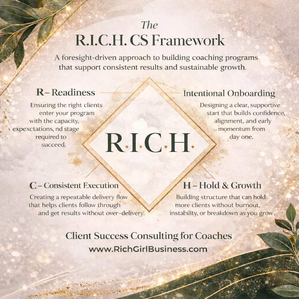 The R.I.C.H. Customer Success Accelerator is a 30-day implementation experience designed to strengthen delivery and support consistent client results as your business grows. It focuses on building structure that reduces over-delivery, protects your energy, and lowers retention or refund risk. This is not about rebuilding your business, but refining what already exists so growth feels calmer, more predictable, and sustainable as you move forward.